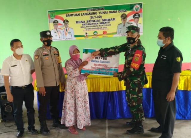 bidikcamera.com, MUBA – Pemdes Sungai Medak Kecamatan Sekayu Kabupaten Musi Banyuasin serahkan Bantuan Langsung Tunai Dana Desa (BLT-DD) Bulan Januari kepada warga yang kurang mampu di Desa Sungai Medak, Rabu (05/05/2021).