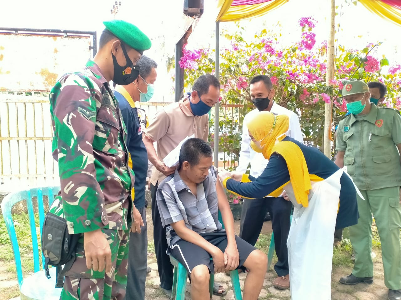 Prosesi vaksinasi disaksikan Babinkantibmas Polsek Lais Aipda Fajri Aprizal, Babinsa Serda Hendri Prayoga, Kepala Puskesmas Gardu Harapan Alexander SKM Mkes bersama tim Vaksinasi dan Kepala Desa Purwosari H Mustamil Jali beserta BPD, LPM dan Perangkat Desa. (bc)