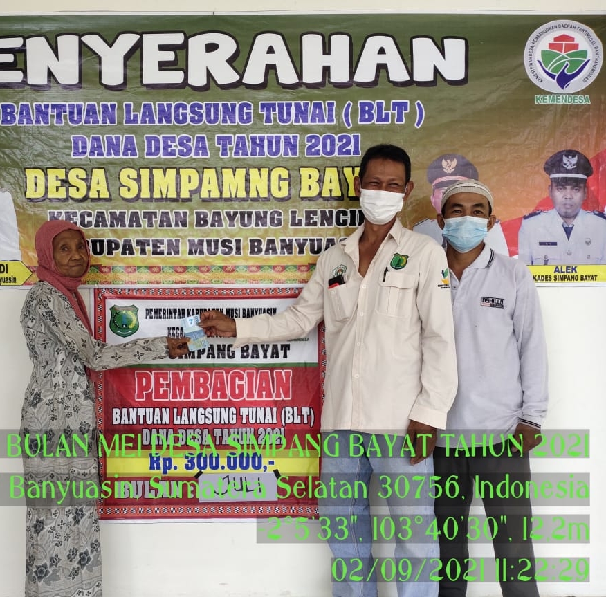 bidikcamera.com, MUBA – Pemdes Simpang Bayat Kecamatan Bayung Lincir Kabupaten Musi Banyuasin bagikan Bantuan Langsung Tunai Dana Desa (BLT-DD) Periode Bulan Juli 2021 kepada warga yang kurang mampu pada Selasa (02/09/21).