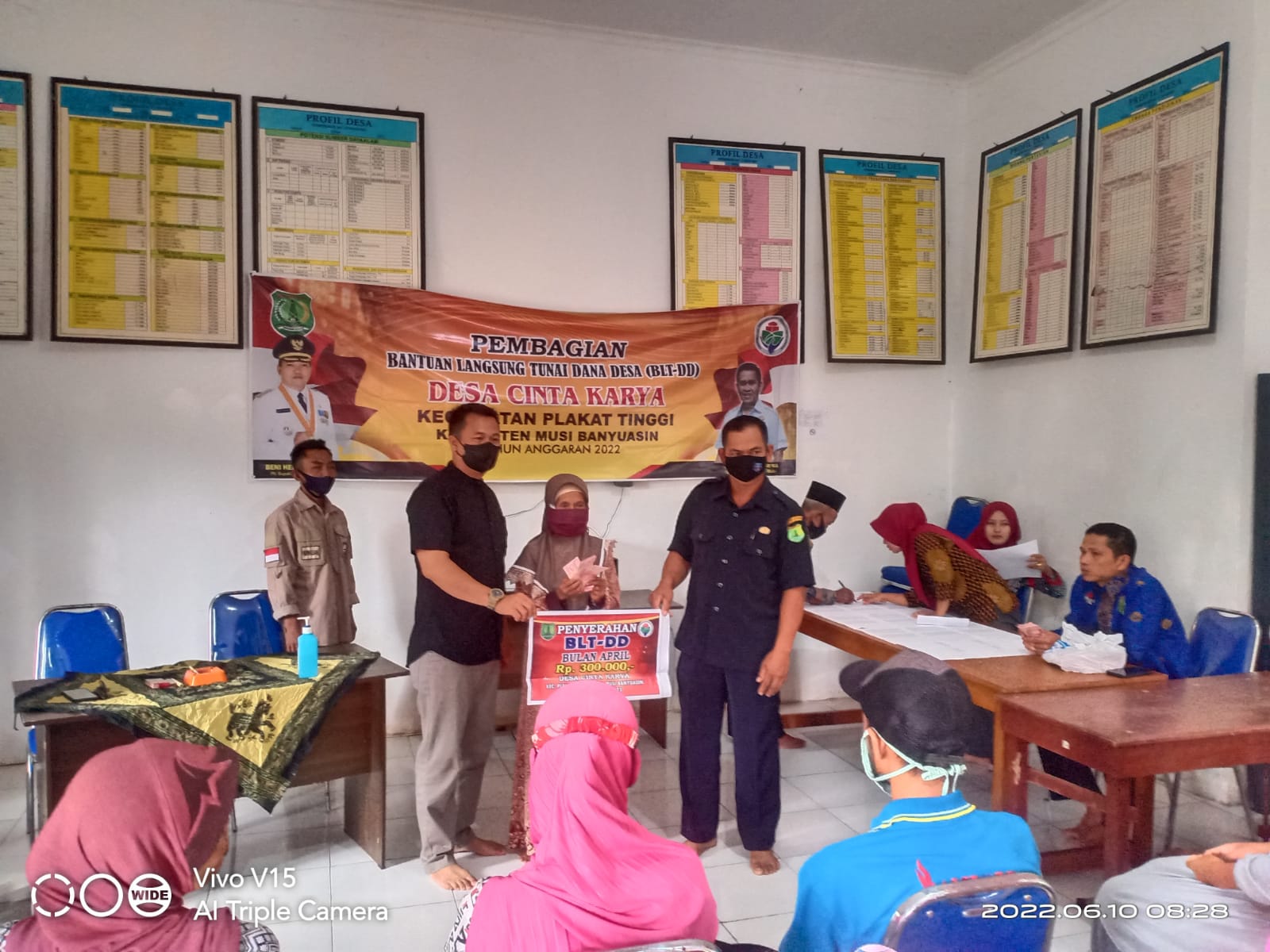 bidikcamera.com, MUBA – Pemerintah Desa Cinta Karya Kecamatan Plakat Tinggi Kabupaten Musi Banyuasin kembali Salurkan Bantuan Langsung Tunai (BLT) DD tahap II untuk bulan April -Juni tahun 2022, sebanyak 117 Keluarga Penerima Manfaat (KPM) pada Jum’at tanggal (10/06/22).