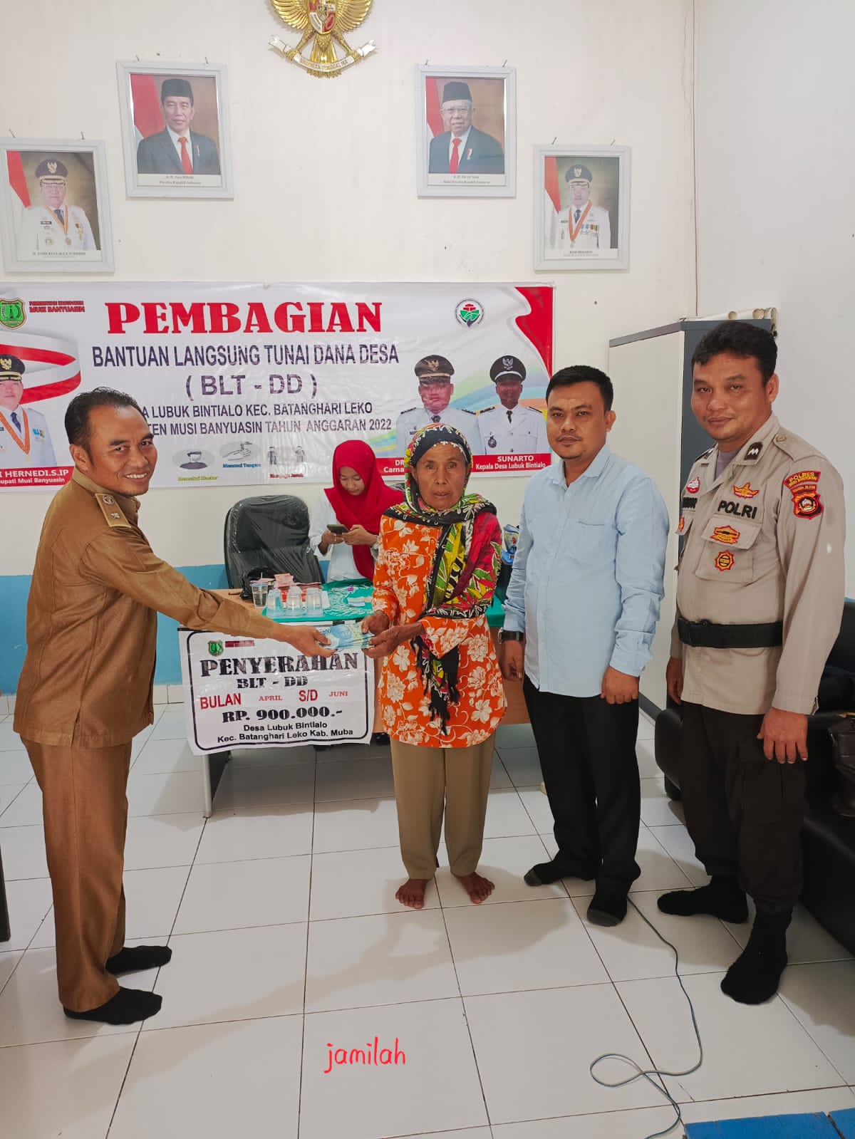 Bantuan BLT-DD di serahkan langsung oleh Kepala Desa dan didampingi oleh Perangkat Desa, Ketua BPD, Pedamping desa, KPMD, LPM dan PLD desa disaksikan Babinkamtibmas serta perwakilan Kecamatan BHL yang mana Penyerahan BLT-DD dilakukan di kantor desa dengan tetap mematuhi protokol kesehatan.
