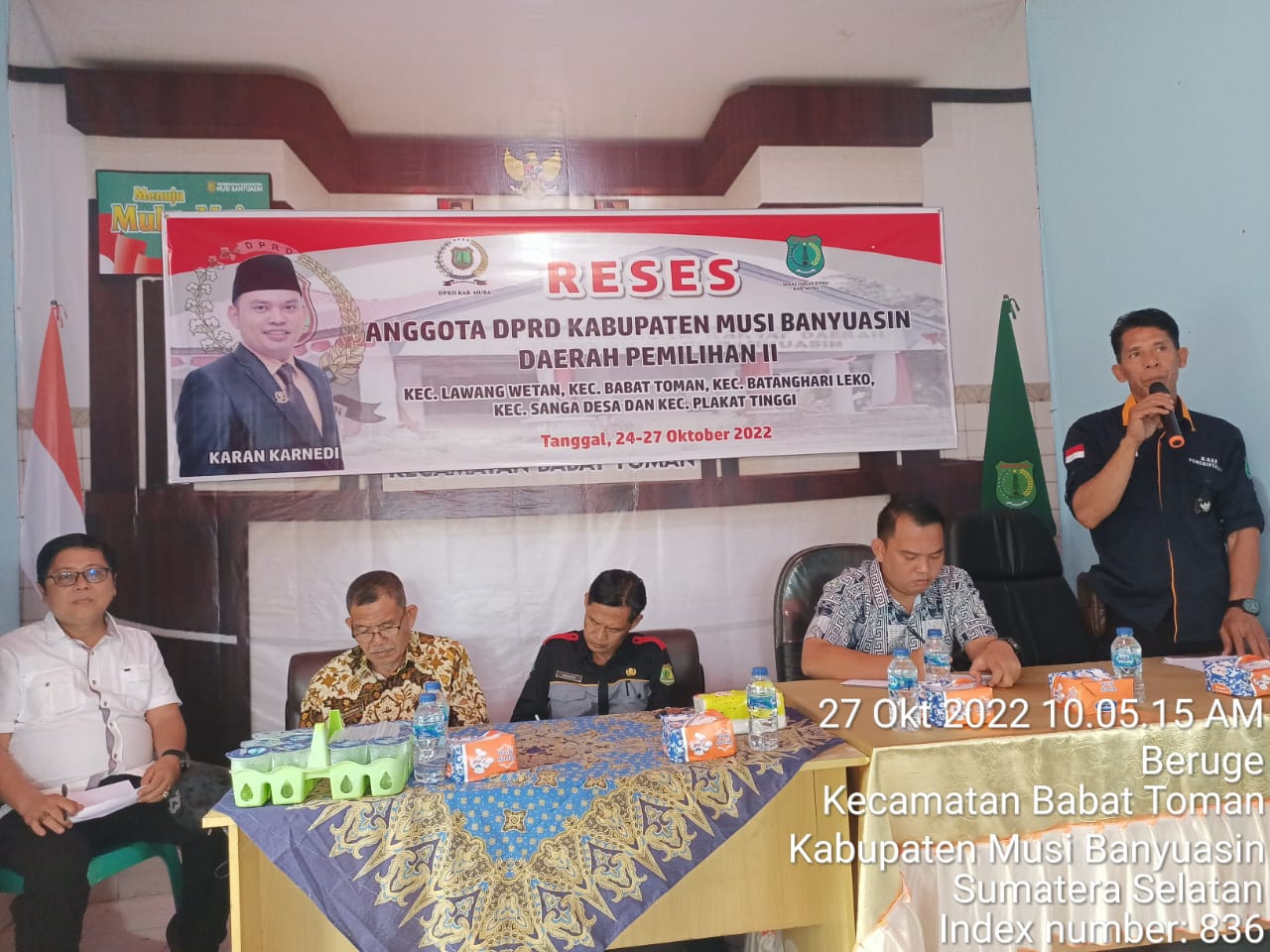 bidikcamera.com, MUBA – Pemerintah Desa Beruge Terima kunjungan Anggota DPRD Muba Dapil 2 Dalam Rangka Kegiatan Rises di Kecamatan Babat Toman Kabupaten Musi Banyuasin guna menjaring dan menyerap Aspirasi warga desa kabupaten Musi Banyuasin, Anggota DPRD Muba Karan karnadi dari partai Golkar mengadakan Reses di Desa Beruge (27/09/22).