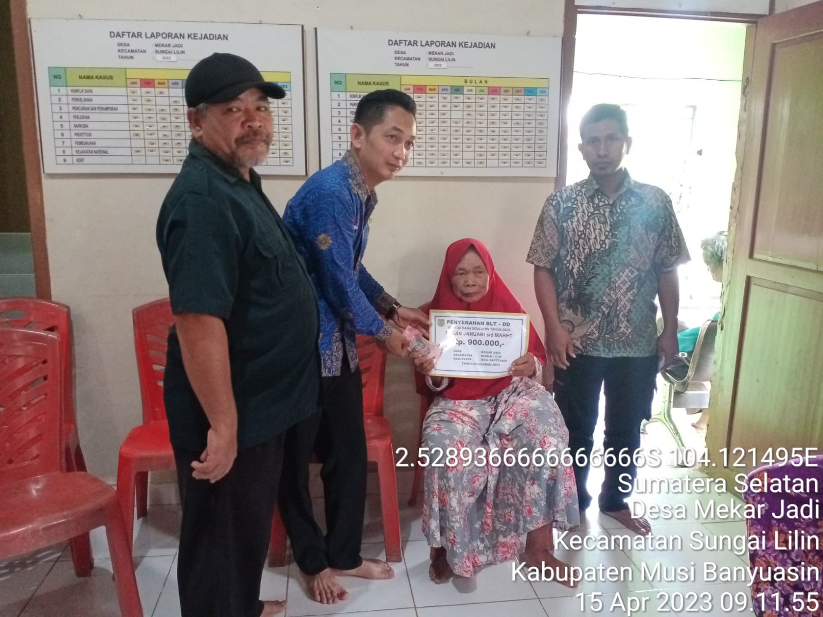 bidikcamera.com, MUBA – Kades Mekar Jadi Kecamatan Sungai Lilin Kabupaten Musi Banyuasin salurkan BLT-DD tahap I untuk bulan Januari – Maret 2023 Sebanyak 24 KPM pada keluarga kurang mampu, Jum’at (15/04/23).