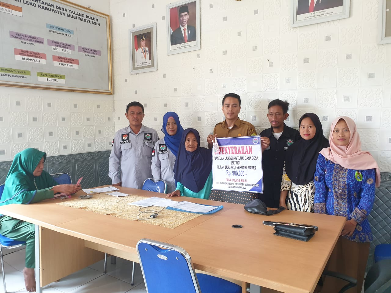 Bantuan BLT-DD diserahkan oleh Kepala Desa, didampingi Perangkat Desa, Ketua BPD, LPM, KPMD, Bidan desa dan Linmas, penyerahan BLT-DD bertempat di kantor desa.