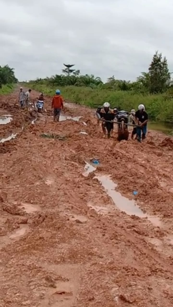 Masyarakat yang melalui jalan Pemda secara bergotong royong menggotong kendaraan Sepeda Motor yang terjebak dari jalan yang rusak dan berlumpur, Selasa (01/05/23).
