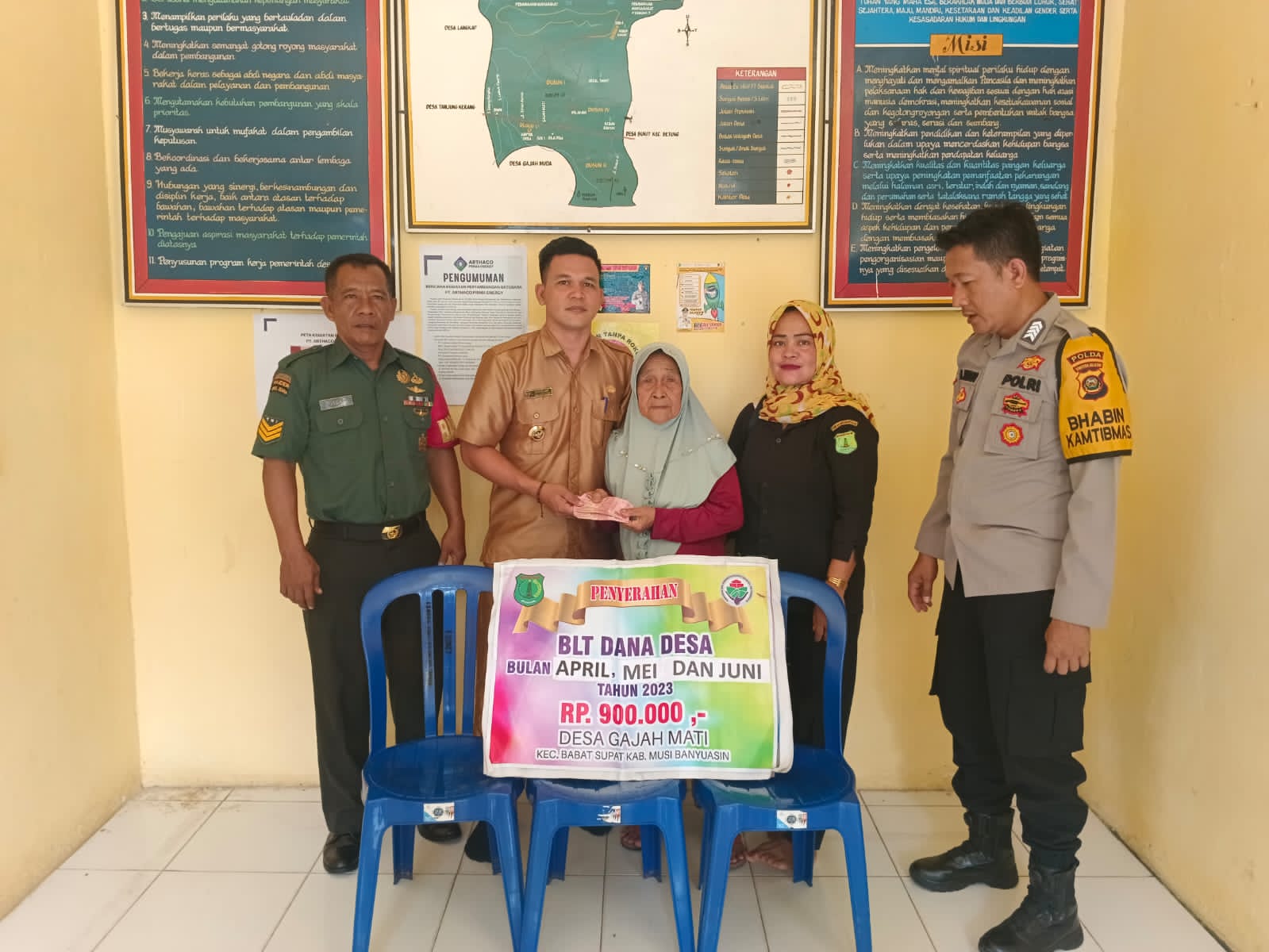 Bantuan BLT-DD diserahkan oleh Kepala Desa yang didampingi Perangkat Desa, Ketua BPD, LPM, KPM, KPMD, pendamping desa perwakilan kecamatan disaksikan Babinsa dan Babinkamtibmas bertempat di kantor Desa.