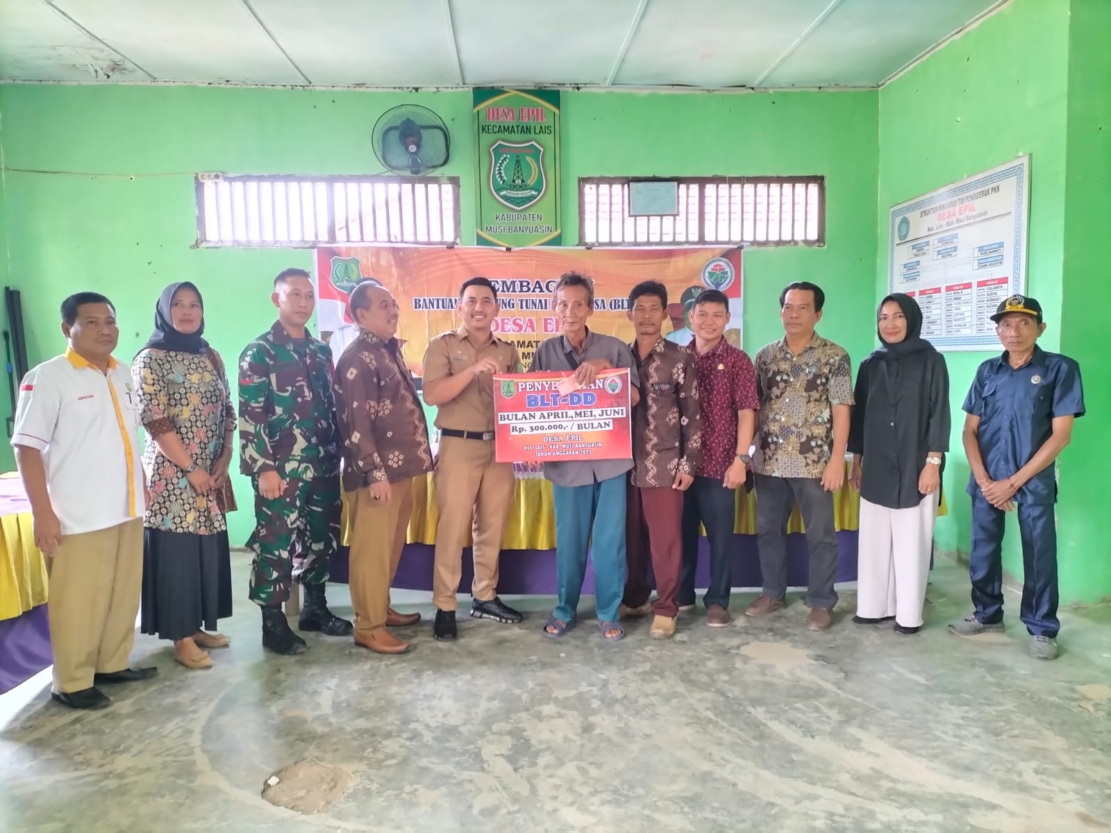 Bantuan BLT-DD diserahkan oleh Kepala Desa yang didampingi Perangkat Desa, Ketua BPD, LPM, KPM, KPMD, pendamping desa perwakilan kecamatan di saksikan Babinsa bertempat di kantor desa.