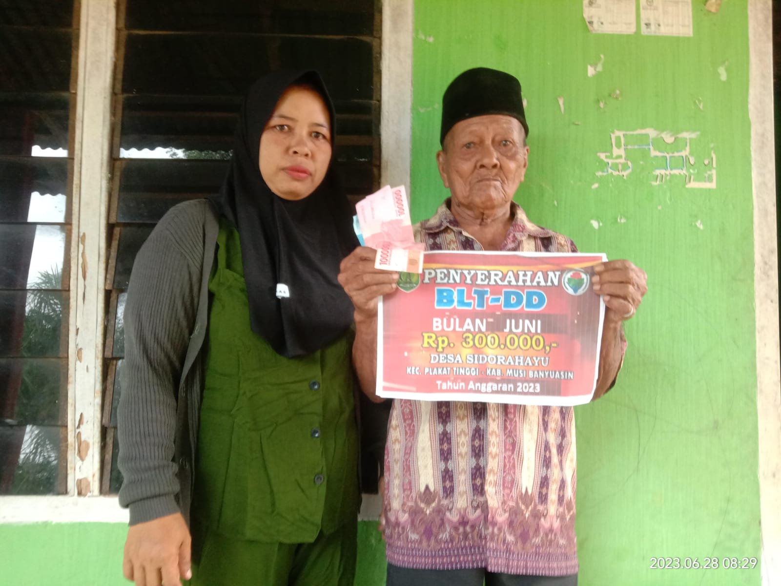 bidikcamera.com, MUBA – Pemdes Sido Rahayu Kecamatan Plakat Tinggi Kabupaten Musi Banyuasin salurkan BLT-DD tahap II untuk bulan April-Juni 2023 sebanyak 30 KPM pada keluarga kurang mampu (28/06/23).