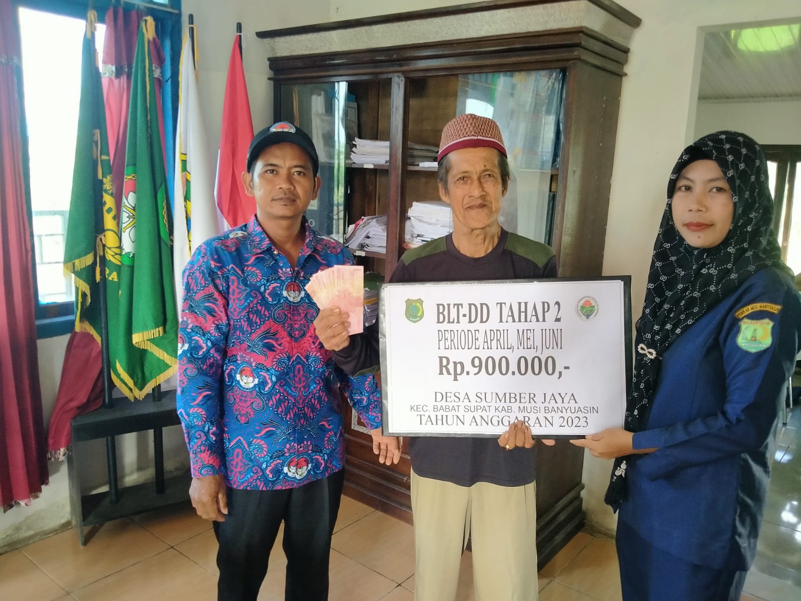 Bantuan BLT-DD diserahkan oleh Kepala Desa yang didampingi Perangkat Desa, Ketua BPD dan anggota, LPM, KPM, KPMD, Pendamping desa serta perwakilan kecamatan bertempat di kantor desa.