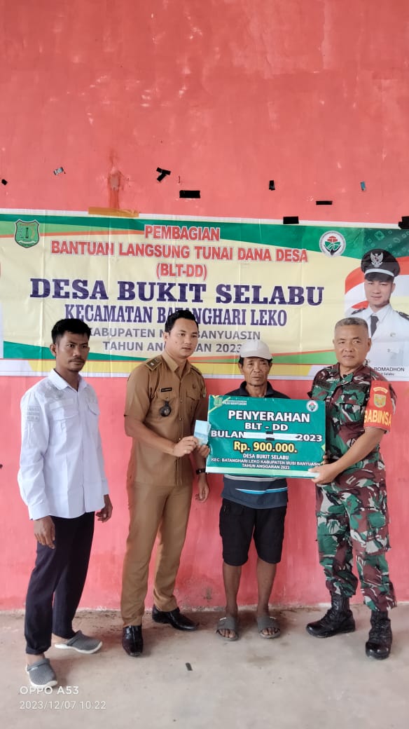 bidikcamera.com, MUBA – Pemdes Bukit Selabu Kecamatan Batang Harileko Kabupaten Musi Banyuasin salurkan BLT-DD periode IV atau periode akhir untuk bulan Oktober, November dan Desember 2023 sebanyak 27 KPM pada keluarga kurang mampu (07/12/23).