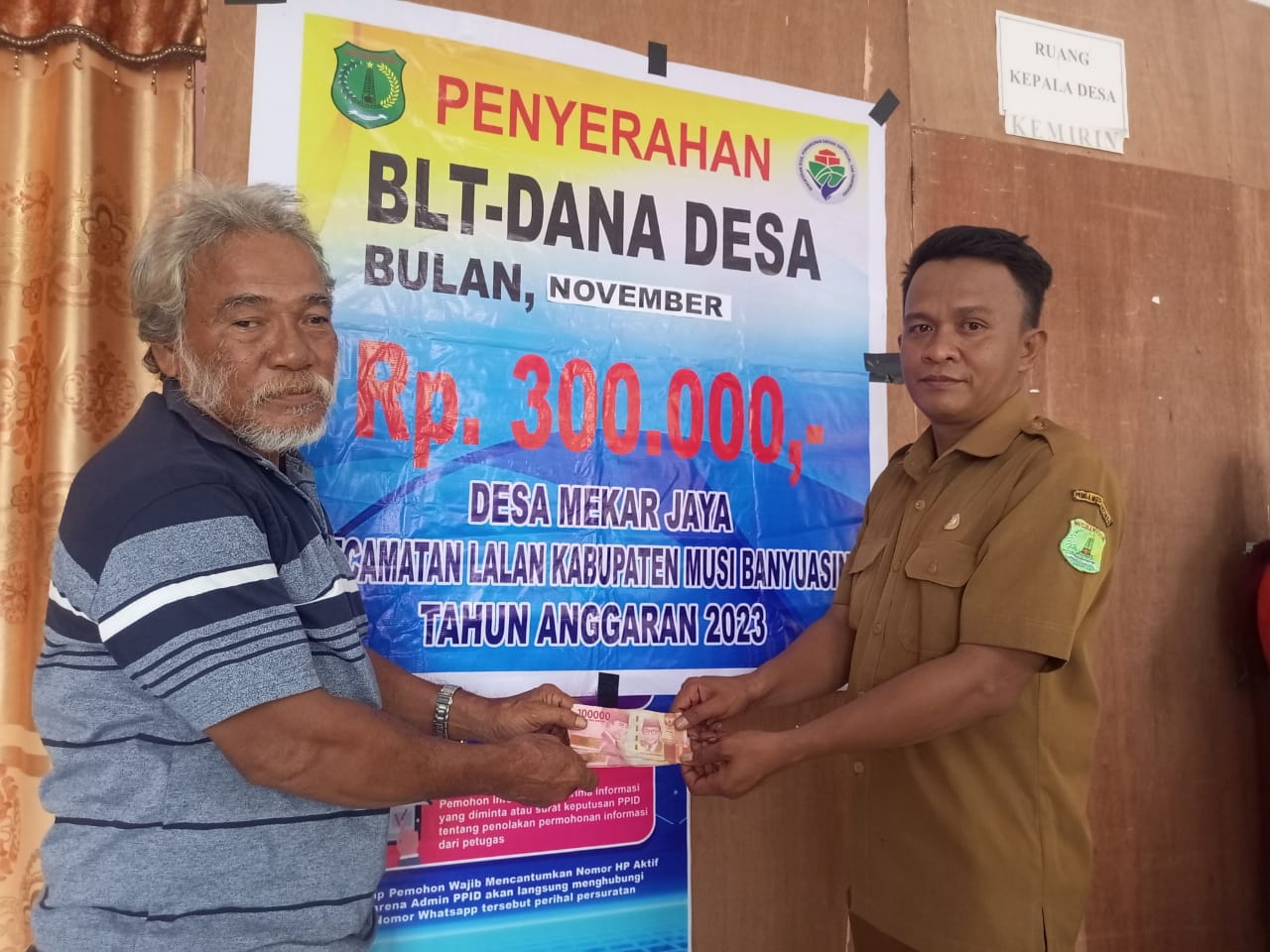 bidikcamera.com, MUBA – Pemdes Mekar Jaya Kecamatan Lalan Kabupaten Musi Banyuasin salurkan BLT-DD periode IV atau periode akhir untuk bulan Oktober, November dan Desember 2023 sebanyak 25 KPM pada keluarga kurang mampu (12/12/23).