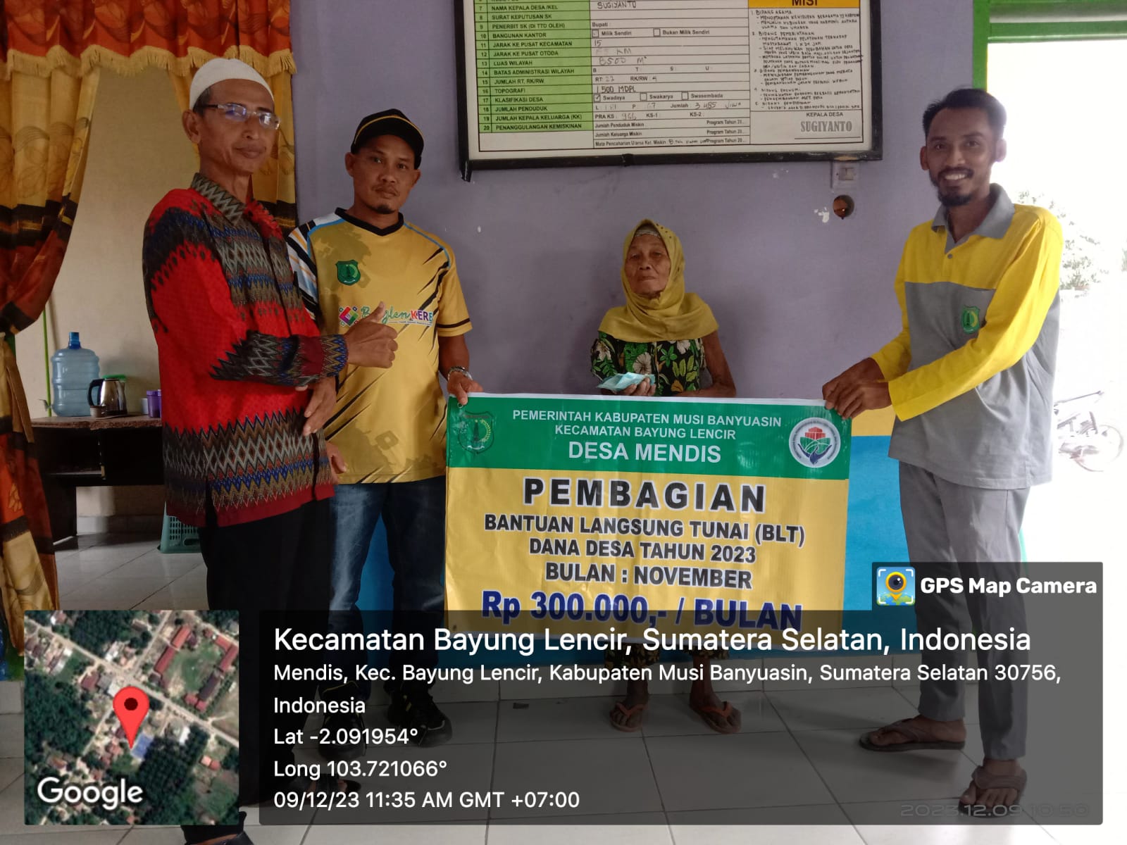 bidikcamera.com, MUBA – Pemdes Mendis Kecamatan Bayung Lencir Kabupaten Musi banyuasin salurkan BLT-DD periode IV atau periode akhir untuk bulan Oktober, November dan Desember 2023 sebanyak 34 KPM pada keluarga kurang mampu (09/12/23).