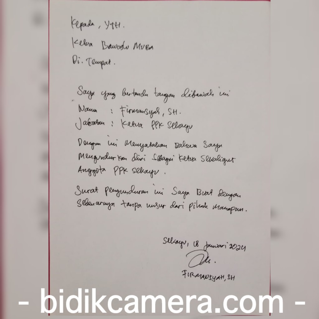 Surat pernyataan pengunduran diri tersebut tertulis tangan yang ditujukan kepada Bawaslu Kabupaten Musi Banyuasin pada tanggal (18/01/24) dan di tandatangani.
