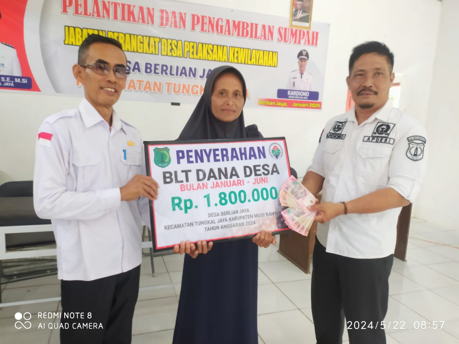Kepala Desa Berlian Jaya Kardiono Sandi mengatakan, “penyerahan BLT-DD tahap pertama ini untuk bulan Januari – Juni 2024 sebesar Rp 1.800.000,- untuk enam bulan, penyerahan BLT ini sesuai dengan intruksi Pemerintah pusat dan dinas PMD dengan tujuan untuk meringankan beban ekonomi warga yang kurang mampu, dan diberikan secara bertahap dengan nominal sebesar Rp 300 ribu/bulannya diserahkan selama enam bulan, dan pemerintah desa juga selain menyalurkan BLT pada masyarakat yang kurang mampu ini bentuk keperdulian kita untuk meringankan beban semoga saja dapat bermanfaat”.