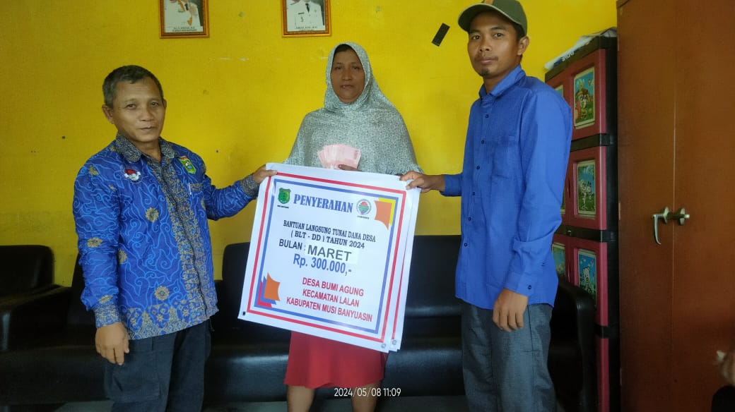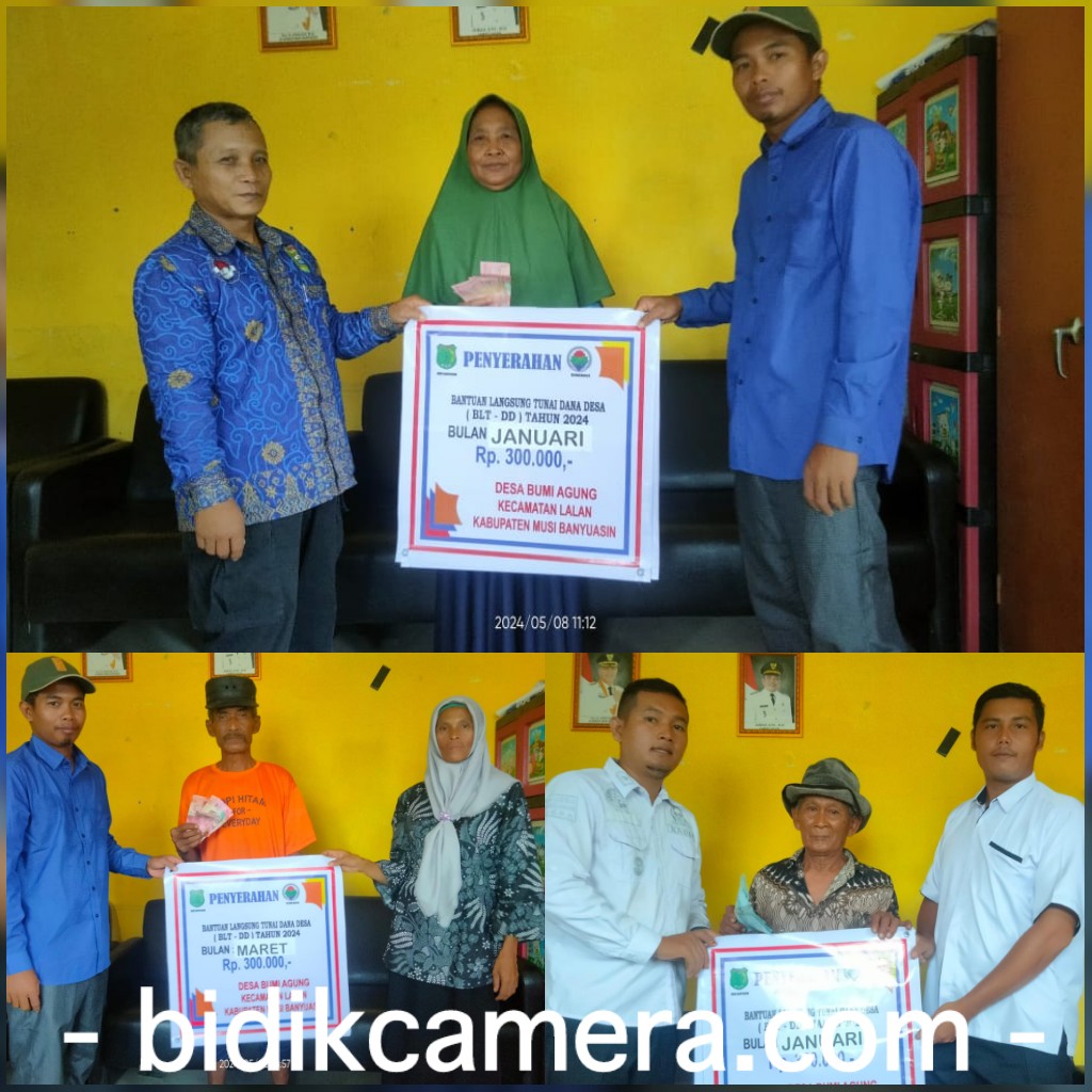 bidikcamera.com, MUBA – Pemdes Bumi Agung Kecamatan Lalan Kabupaten Musi Banyuasin salurkan BLT-DD tahap I untuk bulan Januari, Febuari dan Maret 2024 sebanyak 29 KPM pada keluarga kurang mampu (08/05/24).
