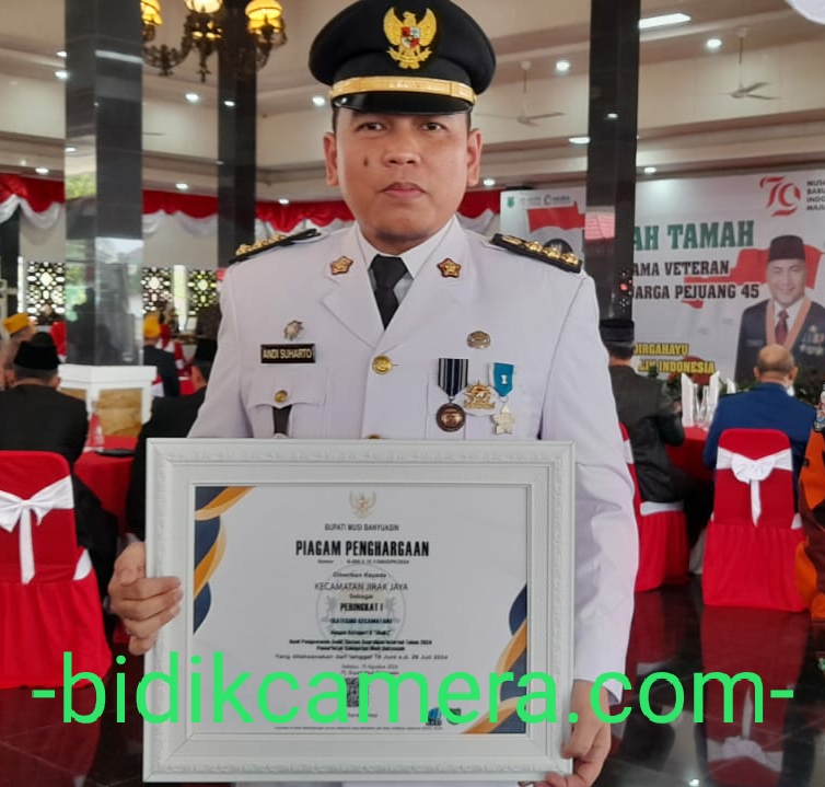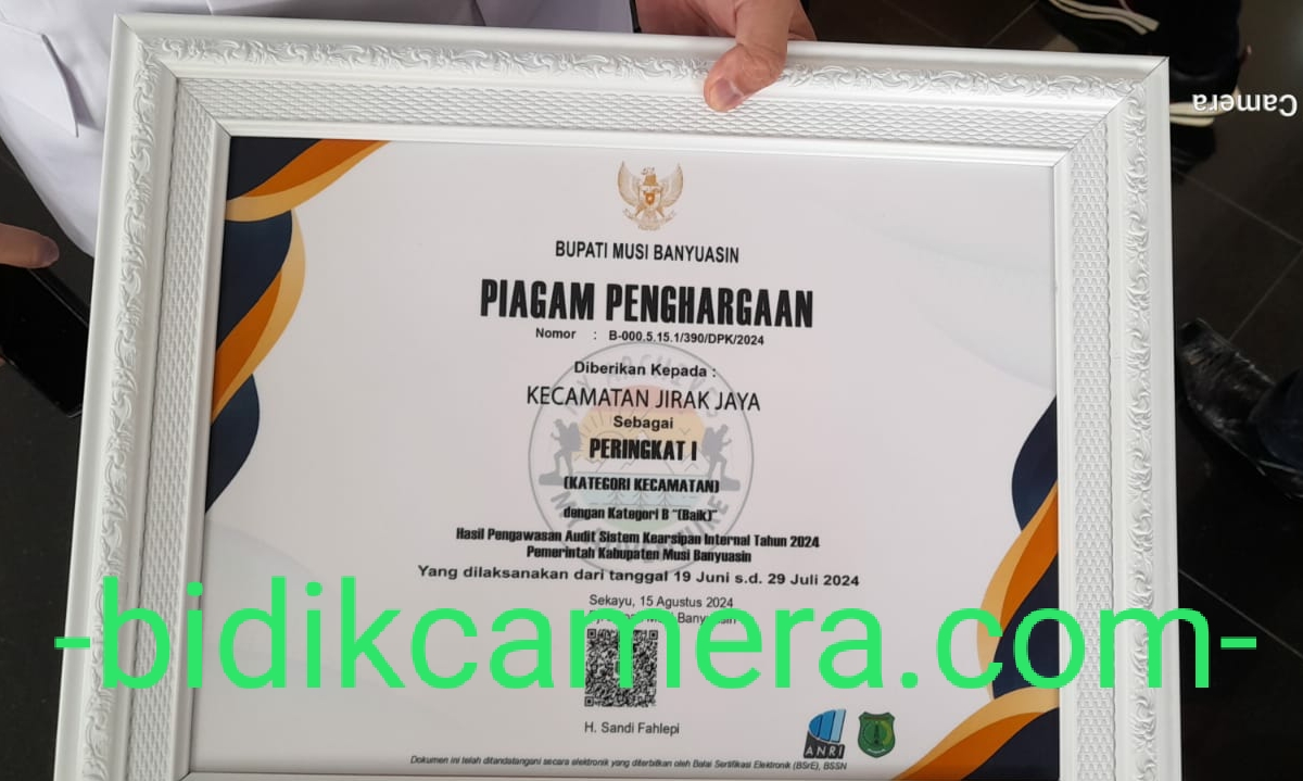 bidikcamera.com,,Musi Banyuasin-Senyum bahagia terpancar dari raut wajah Andi Suharto selaku camat Jirak jaya,pasalnya baru saja mendapatkan bingkai putih yang diberikan oleh bapak Pj Bupati Musi Banyuasin yang berisikan piagam penghargaan atas hasil audit internal kearsipan tahun 2024 yaitu meraih juarah 1.