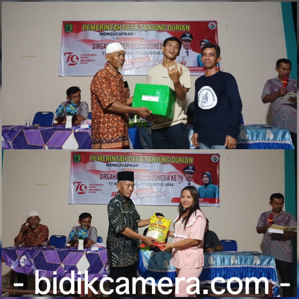 Kepala Desa Tanjung Durian Saniman mengatakan, “alhamdulillah antusias masyarakat desa dalam memeriahkan HUT RI yang ke 79 tahun ini sangat luar biasa, dari anak-anak hingga orang dewasa yang sangat antusias dalam mengikuti perlombaan ini, perlombaan berjalan dengan lancar dan meriah, kemudian diakhir acara pada tanggal 17 Agustus setelah selesai semua perlombaan kita langsung Pembagian hadiahnya”, jelas Kades. (bc)