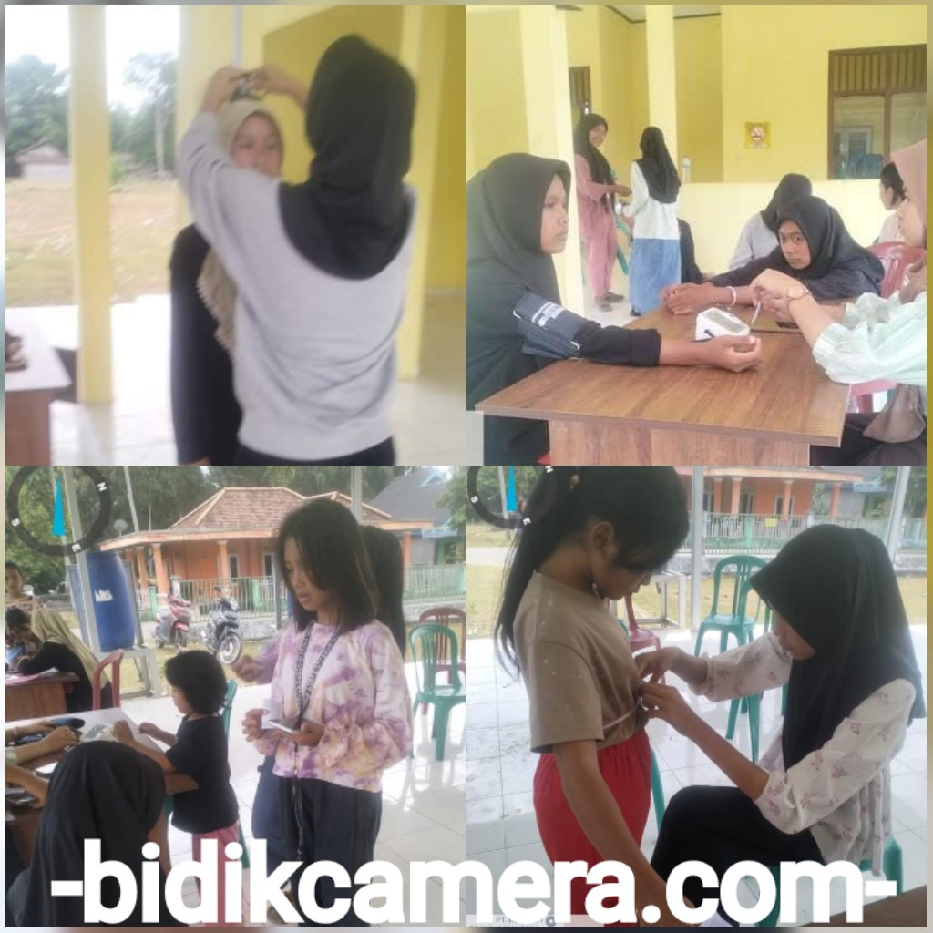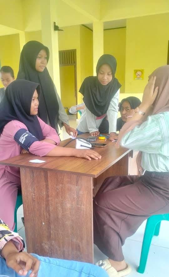 Mereka tidak hanya melakukan pengecekan kesehatan tetapi juga diajari cara mengoperasikan alat kesehatan sederhana secara bergantian.