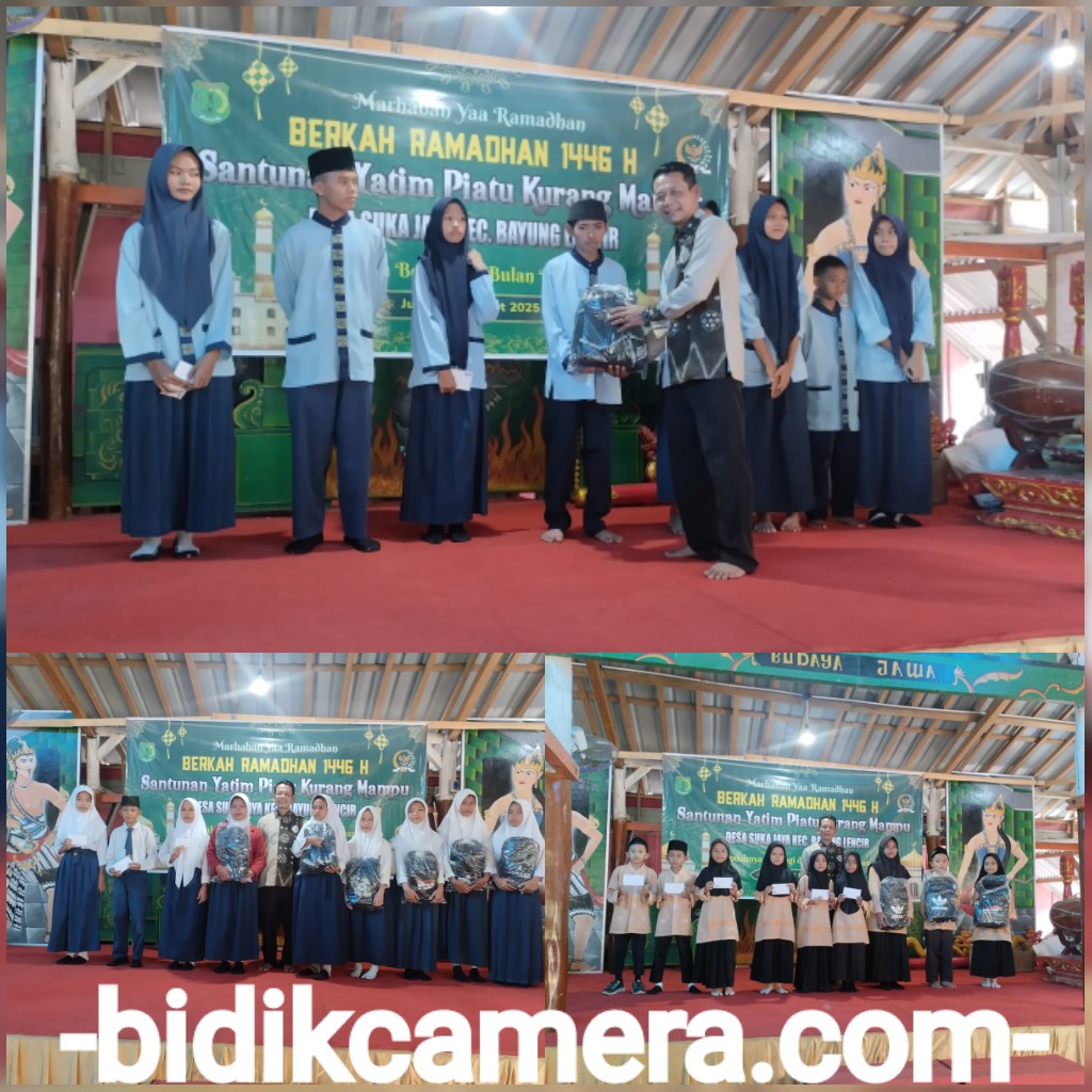 bidikcamera.com, MUBA – Pemerintah Desa Suka Jaya Kecamatan Bayung Lencir Kabupaten Musi Banyuasin memberikan santunan dan sembako kepada 27 orang anak yatim/yatim piatu usia Sekolah Dasar (SD), memberikan bantuan kepada 27 Orang Murid/Siswa SD, SMP dan memberikan bantuan kepada 46 orang murid/siswa RA, TK, SD, MI, MTs, dan SMP yang berprestasi pada Jum’at, (21/03/25).