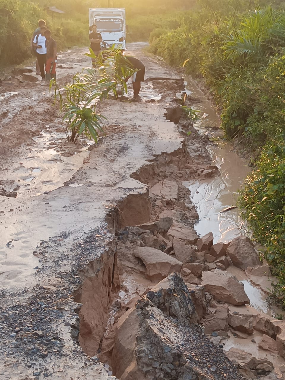 Terbisnya badan jalan akibat rutinitas hujan yang terus-menerus dan kondisi jalan sudah sejak lama rusak dan tidak ada perbaikan dari pemerintah kabupaten.