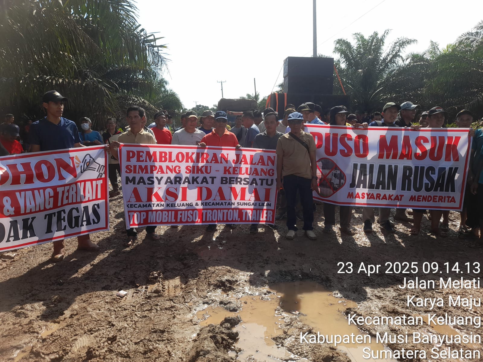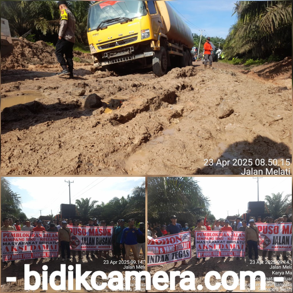 bidikcamera.com, MUBA – Masyarakat A1, A4, Tenggaro, A5 Mulyo asih, A6 Sido Rejo dan Kelurahan Keluang, Kecamatan Keluang Kabupaten Musi Banyuasin Blokir jalan di lokasi jalan yang rusak parah di Desa A4 Tegal Mulyo, Rabu (23/04/25).