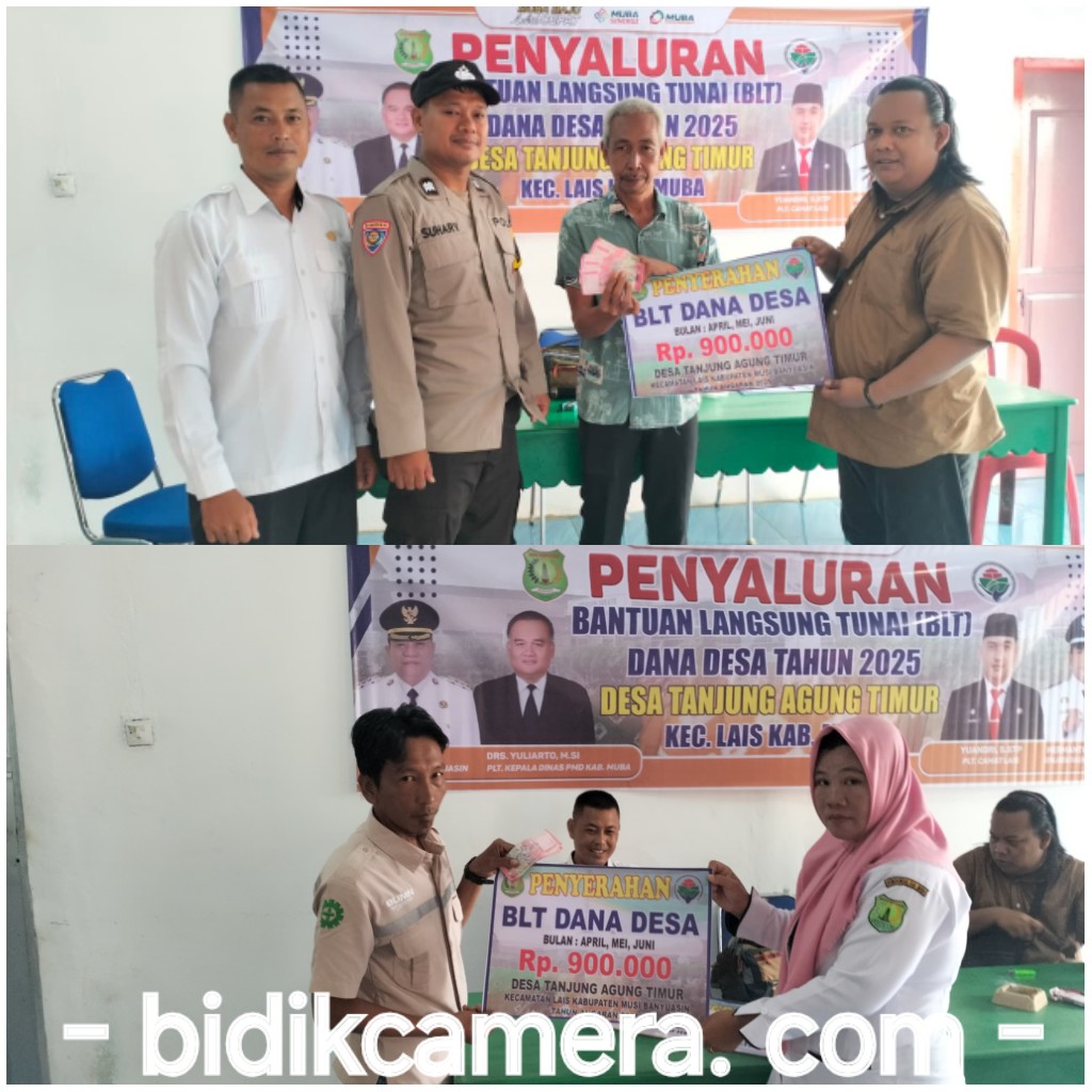 bidikcamera.com, MUBA – Pemerintah Desa (Pemdes) Tanjung Agung Timur (TAT) Kecamatan Lais Kabupaten Musi Banyuasin menyerahkan Bantuan Langsung Tunai (BLT) Dana Desa (DD) tahap II tahun 2025 bertempat di kantor desa (05/06/25), penyerahan BLT-DD kepada KPM dihadiri Kepala Desa, dibantu perangkat desa, BPD, LPM, KPM dan disaksikan oleh Babinkamtibmas.